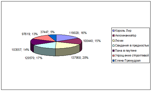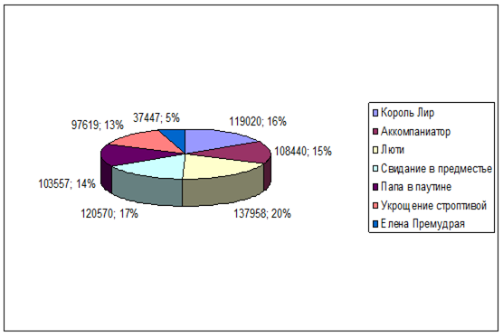 В 2003 году наибольшую долю выручки собрал спектакль «Люми» (20%), а наименьшую – Елена Премудрая (5%).