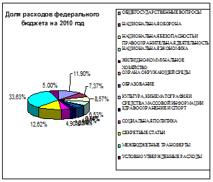 В динамике мы видим, что этот показатель в процентном соотношении снижается. Прогнозируется, что в 2010 году сумма расходов составит 963,10 млрд. руб., что значительно увеличился по отношению к запланированному в 2008 году на 134,32 млрд. руб.. К основным подразделам можно отнести бюджетные ассигнования на судебную систему, обеспечение деятельности финансовых, налоговых и таможенных органов и органов надзора, обслуживание государственного и муниципального долга и другие общегосударственные вопросы. Непосредственно увеличение заработной платы госслужащим (депутатам и их помощникам, судьям, увеличением компенсационных вознаграждений присяжным и арбитражным заседателям, помощников судей арбитражных судов, секретарей судебных заседаний арбитражных судов и т.д.), проведение капитального ремонта административных зданий, обеспечение деятельности Счетной палаты Российской Федерации. И таких ассигнований в каждом подразделе очень много, что свидетельствует о росте этого показателя в целом.