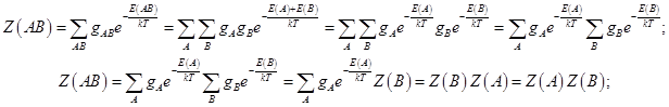 Статистическая сумма системы это мультипликативная функция. Она является произведением статистических сумм подсистем, составляющих систему. Чтобы убедиться в этом, обозначим подсистемы [A,B, …].
