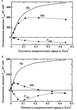 Первое соотношение не содержит корреляционного члена и не является точным. Второе соотношение представляет собой точное выражение. Из данных, приведенных на рис., видно, насколько результаты приближения Пуассона-Больцмана согласуются с результатами моделирования методом Монте-Карло.
