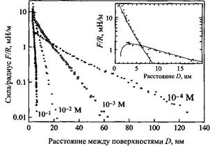 Силы взаимодействия между отрицательно заряженными поверхностями слюды в растворах L1NO3 различной концентрации. Эксперимент проведен с использованием прибора для измерения поверхностных сил