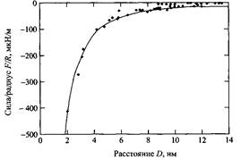 Зависимость силы притяжения Ван дер Ваальса между двумя поверхностями слюды в воздухе от расстояния между пластинами.
