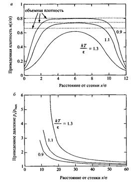 Жидкость Леннард-Джонса между двумя инертными стенками, а - Зависимость приведенной плотности от расстояния между стенками для трех значений приведенной температуры. б - Усиление притяжения вследствие понижения плотности. В подходе Гамакера при расчете притяжения ^ham плотность в зазоре принимается постоянной и равной объемной плотности
