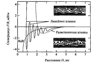 На расстояниях между двумя поверхностями, сравнимых с размерами молекул, на взаимодействие частиц начинают влиять эффекты упаковки. При определенных условиях это приводит к осцилляции профиля плотности и к появлению осциллирующей силы, зависящей от расстояния между поверхностями. Осцилляции могут накладываться на зависимости, отражающие как притяжение, так и отталкивание. Профили плотности для таких модельных систем детально исследованы с помощью компьютерного моделирования. В то же время рассчитать суммарное взаимодействие оказалось намного труднее. Иногда высказывается мнение, что осциллирующий профиль плотности автоматически приводит к осциллирующему профилю силы. Возможно, что это положение справедливо, однако до сих пор оно не доказано. Была осуществлена попытка измерить осцилляторные силы между скрещенными цилиндрами слюды в среде октаметилциклотетрасилана. Оказалось, что период осцилляции вполне соответствует молекулярным размерам. Эти силы слабо зависят от температуры, но небольшие добавки других растворителей или примесей полностью изменяют поведение системы и разрушает картину осцилляции.