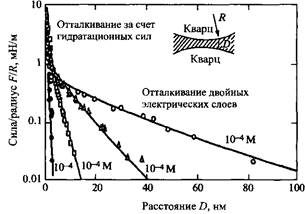 Гидратные силы отталкивания между поверхностями слюды в растворе электролита. Следует отметить, что отталкивание возникает только при концентрации соли > 1мМ.