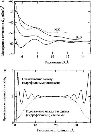 Гидратные силы отталкивания и гидрофобное притяжение для смачиваемой и несмачиваемой стенок соответственно. Теоретические данные получены из обобщенной теории Ван дер Ваальса