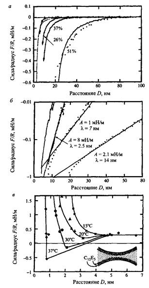 Было обнаружено очень сильное, короткодействующее взаимодействие между липидными бислоями. Расстояния, на которых проявляется это взаимодействие, лежат в диапазоне 10-30 А. Отталкивание экспоненциально уменьшается с увеличением расстояния между липидным монослоями. Для измерения соответствующей силы была использована методика, основанная на измерении осмотического давления. Аналогичным образом методом измерения поверхностных сил с помощью специального прибора были измерены силы отталкивания между поверхностями слюды. Гидратные силы отталкивания, по-видимому, действуют как между нейтральными, так и между заряженными поверхностями. Несмотря на то что поверхности слюды жесткие, а би-слойные структуры - гибкие, оба исследования дали удивительно хорошо согласующиеся результаты. Отталкивание между поверхностями слюды наблюдалось и в других жидких средах.