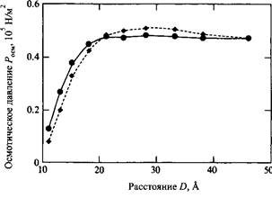 Осмотическое давление пропорционально концентрации ионов посередине между заряженными стенками, из чего следует, что отталкивание двойных слоев имеет главным образом энтропийную природу. При сближении заряженных поверхностей вторая поверхность ограничивает объем, в котором находятся противоионы, относящиеся к первой поверхности, и наоборот. Вследствие этих пространственных ограничений для противоионов и возникает отталкивание. В трактовке этого вопроса иногда можно встретиться с недопониманием сути, когда физической природой отталкивания между двумя заряженными коллоидными частицами считают их прямое электростатическое взаимодействие. Эта сила, конечно, имеет электростатическую природу, поскольку у незаряженных коллоидных частиц не существует противоионов, но она проявляется в виде энтропийного вклада. Корреляционный член, показанный на рис., всегда отражает притяжение и имеет ту же природу, что и квантово-механические дисперсионные силы. Он также действует между сферическими макроионами, окруженными противоинами. В этом случае корреляционная свободная энергия уменьшается с расстоянием г между макроионами как г*. Заметим, что величина корреляционного вклада практически одинакова для одно - и двухзарядных ионов. Однако он становится значительным в последнем случае из-за относительно небольшого вклада энтропии. Необходимо твердо помнить о том, что применять уравнение Пуассона-Больцмана для систем с двух - или многозарядными противоионами, а также при очень высоких концентрациях солей следует с очень большой осторожностью.