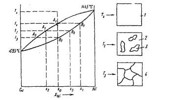 , то при температурі T1 досягають кривій ліквідусу в крапці А1. При цьому починається виділення кристалів твердого розчину, состав якого відповідає крапці Bi, тобто кристали збагачені нікелем. При подальшому зниженні температури розплав збіднюється нікелем, тому що викристалізовуються змішані кристали, збагачені нікелем. Состав розплаву змінюється по кривій ліквідусу від А1 до А3, а cклад змішаних кристалів — по кривій солідуса від B1 до В3. При температурі Т3