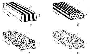 Характерним для евтектичних структур є особливе просторове розташування чистих компонентів. Відповідно розподілу обох твердих фаз розрізняють, наприклад, пластинчасті, кульові (глобулярні), стержнеподібні або голчастіевтектичні структури. Найважливішіевтектичні структури показані на мал. 8.