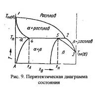 З розплаву, що має состав від 100% компонента А до концентрації хА, виникають спочатку змішані кристали , богатые компонентом А. Нижче перитектичної температури схильність до утворення змішаних кристалів зменшується й починається випадання змішаних кристалів . Таким чином, при низьких температурах структура складається зі змішаних кристалів а, у які вкраплені кристали . У середньому діапазоні концентрацій між хА й хп а-тверді розчини змінногосостава спочатку перебувають у рівновазі зі своїм розплавом. Нижче перитектичної температури Тп - змішані кристали а, реагуючи перитектично із залишком розплаву, перетворюються в кристали . Перитектичну реакцію можна описати рівнянням: