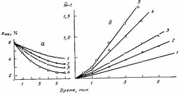 Увеличение вязкости на начальных стадиях отверждения ПУ может быть обусловлено удлинением макромолекулярных цепей вследствие протекания процесса линейной конденсации, поскольку используемые олиго-меры представляют собой бифункциональные соединения. В этом случае скорость роста макромолекулярных цепей отражается кинетикой уменьшения концентрации концевых функциональных групп. Изменение концентрации концевых NCO-групп до образования визуально наблюдаемой в растворе нерастворимой фракции показано на рис. 1, а. Кинетика процесса поликонденсации двух бифункциональных мономеров при их экви-мольном соотношении обычно описывается уравнением второго порядка по концентрации функциональных групп, интегрирование которого дает следующее известное выражение для среднечисленной степени поликонденсации образующего полимера: N—l=Xokt, где N — степень поликонденсации; Хо — начальная концентрация функциональных групп; к — константа скорости реакции; t — время.