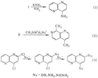Нітрування йде лише для нафтиридину, що містить електронодонорні замісники, напр. для нафтиридинонів. Нафтиридини легко реагують з нуклеофілами, напр. піддаються амінуванню по Чичибабина реакції, метилюванню метилсульфанілметильним аніоном, одержуваним дією сильних основ на, по α- і g‑положеннях до атомів N‑галогензаміщених нафтиридинів обмінюють атом галогену на різні нуклеофіли.