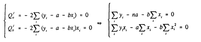 Для оценки параметров a и b воспользуемся МНК, который минимизирует сумму квадратов отклонений фактических значений уi от расчетных. Минимум ищется по переменным а и b.