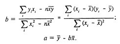 Если уравнение (3) разделить на п, то получим у=а+bх (здесь  - средние значения х и у). Таким образом, линия регрессии проходит через точку со средними значениями х и у. Подставив величину а из (3) в (4), получаем
