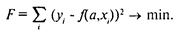Для решения этой задачи существует два пути. Во-первых, может быть осуществлена непосредственная минимизация функции F с помощью методов нелинейной оптимизации, позволяющих находить экстремумы выпуклых линий. Это, например, метод наискорейшего спуска, при использовании которого в некоторой исходной точке определяется антиградиент (направление наиболее быстрого убывания) функции F. Далее находится минимум F при движении в данном направлении, и в точке этого минимума снова определяется градиент. Процедура повторяется до тех пор, пока разница значений f на двух последовательных шагах не окажется меньше заданной малой величины. Другой путь состоит в решении системы нелинейных уравнений, которая получается из необходимых условий экстремума функции F. Эти условия - равенство нулю частных производных функции F по каждому из параметров аj., т.е.