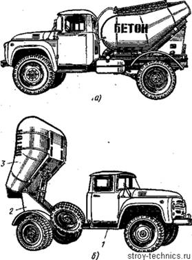 - специализированные машины, предназначенные для транспортирования готовых бетонных смесей и растворов на расстояние до 45 км. Высокие кузова каплевидной формы с крышкой, имеющие двойную обшивку с пространством между листами, куда в холодную погоду направляют выхлопные газы или помещают теплоизоляцию, располагаются в зоне минимальной вибрации рамы базового автомобиля, благодаря чему обеспечивается нерасслаиваемостъ бетонной смеси и предотвращается её разбрызгивание в процессе перевозки.
