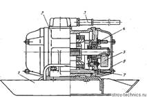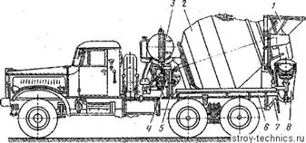 Рис.2. Автобетоносмеситель: 1 — загрузочный бункер; 2 — смесительный барабан; 3 — бак для воды; 4 — привод смесительного барабана; 5 — механизм управления; б — рама смесителя; 7 — шасси; 8 — разгрузочный лоток