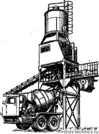 Перед выгрузкой поворотный лоток устанавливают на угол, достаточный для свободного выхода бетонной смеси. При загрузке в барабан готовой смеси автобетоносмеситель служит только средством транспортирования. В этом случае барабан в пути следования медленно вращается, предотвращая расслоение бетонной смеси.Для загрузки автобетоносмесителей предназначены бетоносмесительные установки (рис.3).