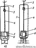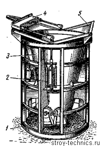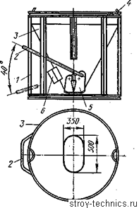 Неповоротные бадьи вместимостью 0,5 м3 и 1 м3 (рис.4) используют преимущественно на заводах сборных железобетонных изделий. Бадья состоит из каркаса, к которому приварен корпус 3 цилиндроконической формы, закрываемый снизу затвором 5. Затвором управляют с помощью рычага.