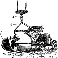 Рис.5. Выгрузка бетонной смеси в поворотную бадью вместимостью 3,2 м3: 1 — корпус бадьи, 2 — полозья, 3 — затвор, 4 — траверса, 5 ~ крюк крана