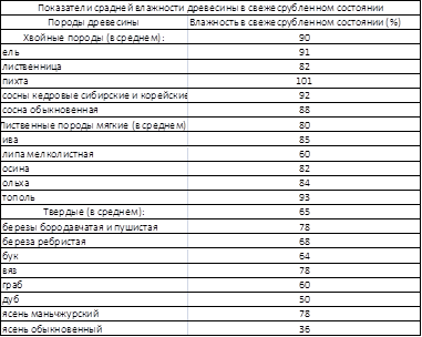 (в таблице 2, в приложении, приведены показатели средней влажности древесины в свежесрубленном состоянии).