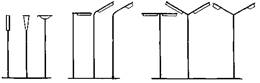 Необходимо также упомянуть о типе опоры с одним венчающим светильником, накрытым сверху крышей, – отражателем. Эти светильники с лампами накаливания или люминесцентными редко применяются для освещения больших улиц. Чаще их устанавливают на малых улицах, небольших площадях, вокруг памятников, у входов в парки и в некоторых других местах города, где желательно выделить более освещенную небольшую площадь.