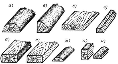 а — пластина; б — четверть; в — чистообрезная доска; г — необрезная рейка; о — двухкантный брус; е — чистообрезной брус (четырехкантный брус); ж — горбыль; а — трехкантный брус (половина двухкантного бруса); и — шпала.
