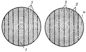 1 — сердцевинная доска; 2 — центральные доски; 3 — боковые доски; 4 — горбыли.