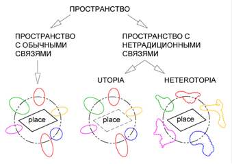 Это утопии и гетеротопии. Утопии - это местоположения без реального места, поддерживающие с реальными пространствами отношения прямой или обратной аналогии (например, идеальный город, общество). Гетеротопии - это, наоборот, места вполне реальные, которые, однако, являются местами без места - контр-местоположениями; они представляют, опровергают, переворачивают все другие местоположения, являются своего рода реализованными утопиями; это своего рода мифическое и реальное оспаривание конкретного места. (рис.1)