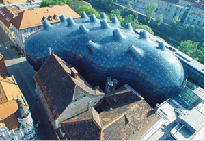 гипермаркет Selfridges в Бирмингеме, Future Systems (рис.2) - "лягушачья икра", "дом в чешуе", "мыльный пузырь"; Kunsthaus в Граце, Питер Кук и Колин Фурнье (рис.3) - "дом-печенка", "кит";