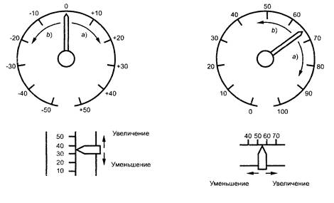 Отметки на индикаторах (например стрелка, указатель уровня жидкости) должны быть всегда видны и в тех случаях, когда они выходят за пределы шкалы. Рекомендуется применение индикаторов с движущейся стрелкой и неподвижной шкалой. На рисунке 4 представлены рекомендуемые направления движения стрелок индикаторов для уменьшающихся и увеличивающихся значений. Нулевое значение должно быть расположено так, чтобы увеличение вызывало движение по часовой стрелке или вверх, а уменьшение вызывало движение против часовой стрелки или вниз.