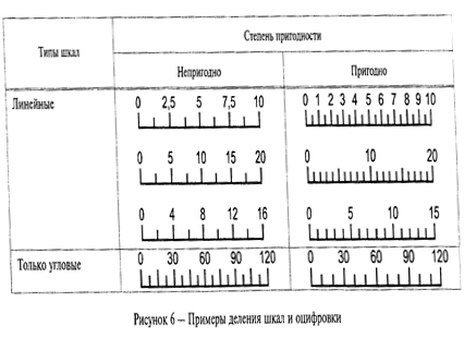 Деление шкалы является важным средством улучшения идентификации значений шкалы Деления должны соответствовать требуемой точности измерений и точности передачи информации. Трехступенчатое деление больше не должно применяться (длинные, средние и короткие линии) Между двумя длинными линиями нельзя размещать более четырех средних линий (т. е. пяти промежутков) и более четырех коротких линий (т. е. пяти промежутков) между двумя средними линиями. Кратность между двумя короткими линиями может быть 1, 2, 5, 10. Возможность идентификации при различных способах деления не всегда удовлетворительна. На рисунке 6 даны примеры правильного деления шкал.