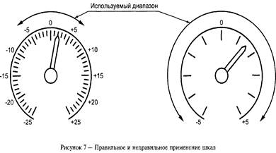 Диапазоны шкал должны быть выбраны таким образом, чтобы они соответствовали диапазонам измерений. Например, на рисунке 7 при диапазоне измерений от минус 5 до плюс 5, справа показана рекомендуемая шкала, а слева — непригодная.