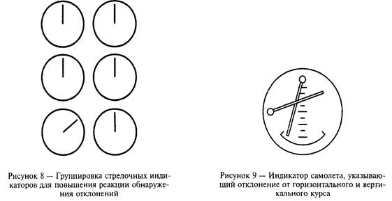 Для того, чтобы по возможности упростить обнаружение аномальных состояний, индикаторы должны быть расположены так, чтобы в нормальном состоянии все стрелки имели одинаковое угловое положение (рисунок 8). Рекомендуется применять интегрированные аналоговые индикаторы (рисунок 9). Аналоговые индикаторы особенно пригодны для объединения различных шкал для одновременного считывания показаний и повышения реакции.