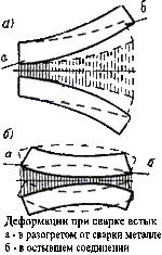 В процессе наложения шва остывающий металл производит на ранее наплавленную часть воздействия внецентренного сжатия, а сам подвергается стягиванию последующим наплавленным металлом ("Сварочные напряжения при сварке встык", эпюра на рис. Б). Свариваемые встык полосы изгибаются при сварке выпуклостью внутрь (рис. слева); при остывании полосы стремиться разогнуться и принять форму выпуклостью наружу, отчего возникают поперечные напряжения: растягивающие - в средней части шва и сжимающие - по краям ("Сварочные напряжения при сварке встык", рис. В).