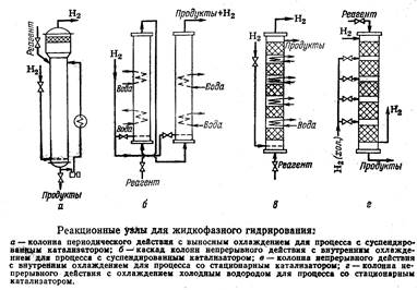 · с суспендированным в реакционной среде катализатором, который или формируется в реакционной среде, например, при разложении неустойчивых соединений или измельчается вне реактора и вводится в виде пасты в сырье. В обоих случаях достаточно сложным оказывается отделение катализатора от продуктов реакции; кроме того, возникают затруднения, связанные с эрозией аппаратов, трубопроводов, арматуры. Катализатор быстро истирается, поэтому суспендирование применяется для быстро дезактивирующихся катализаторов.