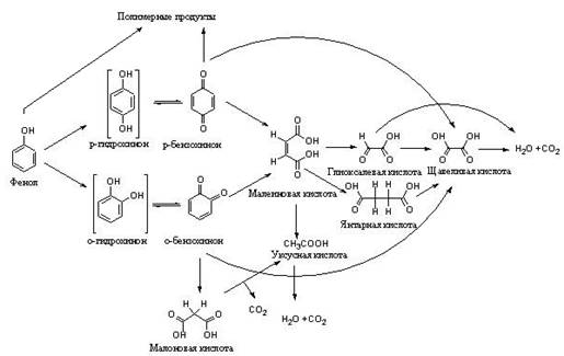 C, P=0,1-20 МПа, на металлических и металооксидных Pt, Ru, Rh, Pd, Fe, Ni, Cu, Cr, V, Co, Zn, Mn катализаторах с содержанием активного металла 0,01-40% [1, 2, 5-30] (табл. 1-3). Мы рассмотрим использование гетерогенных катализаторов, как наиболее широко применяемых в промышленности и научных исследованиях. В ходе процесса окисления фенольных соединений, как указано выше, образуется большое количество промежуточных соединений: о, р –бензохиноны, о, р-гидрохиноны, р-гидрокибензойная кислота, тетрогидро-р-бензохинон, малеиновая, малоновая, фумаровая, янтарная, уксусная, щавелевая, глиоксалевая, муравьиная кислоты и нерастворимые полимерные продукты и углекислый газ [12-25] (рис. 1.).