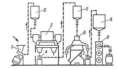 Схема непрерывнопоточной установки АВЖ для производства животных жиров: 1 — центробежная машина АВЖ-245; 2, 5 — питательные бачки; 3 — центрифуга; 4, 7 — центробежные машины АВЖ-130; 6 — сепаратор; 8 — приёмник жира; 9 — шнековый охладитель.[13]