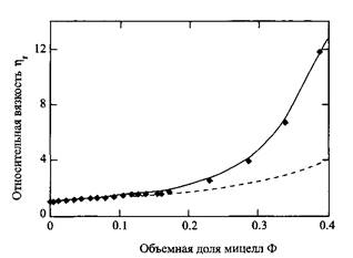 В разбавленных растворах, когда мицеллы не перекрываются, они ведут себя как независимые единицы. При превышении объемной доли мицелл, равной ф*, т.е. в полуразбавленном концентрационном режиме, мицеллы запутываются и возникают сетки зацепления. Такие сетки можно описать с помощью корреляционной длины, которая не зависит от размера мицелл и их полидисперсности. В системе, показанной на рис., объемная доля перекрывания равна - 0.1%. Вязкость дисперсий длинных линейных мицелл можно анализировать в рамках представлений о мицеллярном движении, используя, например, модель так называемой рептации для полимерных систем. Подразумевается, что мицеллы "ползут" через трубки в пористой структуре, образованной другими мицеллами. Вязкость нулевого сдвига з зависит от размера мицеллы и объемной доли ц: