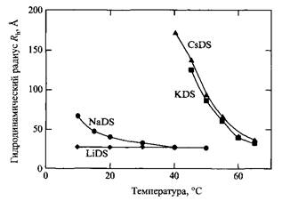 Размер мицелл додецилсульфатов щелочных металлов уменьшается с увеличением температуры и чрезвычайно чувствителен к природе противоиона. Состав систем: LiDS,20 г/л + IMLiCl; NaDS,20 г/л + 0.45 MNaCl; KDS, 5 г/л + 0.45 MKCl; CsDS, 5 г/л + 0.45 MCsCl. Видно, что в системах с KDS и CsDS, несмотря на более низкую концентрацию этих ПАВ, размеры увеличиваются сильнее, чем в системах, содержащих LiDS или NaDS.