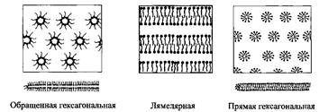 Как видно из рис., такая фаза возникает при регулярной упаковке небольших мицелл, которые сохраняют свойства, присущие мицеллам в растворе. По форме мицеллы представляют собой не сферы, а скорее короткие вытянутые эллипсоиды с соотношением осей 1: 2, что обеспечивает более плотную их упаковку. Это чрезвычайно вязкая фаза.