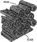 Например, гексагональная фаза построена из гексагонально упакованных цилиндров воды, окруженных полярными группами молекул ПАВ, а непрерывной средой является неполярная фаза. Обращенные кубические фазы и обращенные мицеллы аналогичным образом состоят из глобулярных ядер воды, окруженных молекулами ПАВ. Радиус таких микрокапель воды обычно составляет 20-100 А.