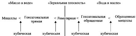 Схема Фонтелля, отражающая зависимость структур жидких кристаллов ПАВ от состава, иллюстрирует симметрию кривизны агрегатов относительно структуры ламелярной фазы и четыре положения основных кубических фаз