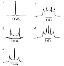Величина расщепления дублета зависит от степени анизотропии и, например, в два раза больше для ламелярной фазы, чем для гексагональной при одинаковых условиях. В двухфазной области, т.е. при равновесии двух фаз, наблюдаются перекрывающиеся спектры обеих фаз. в - Если в системе образовались изотропная и анизотропная фазы, регистрируется спектр с одним синглетом и одним дублетом, г - В случае образования двух анизотропных фаз наблюдаются два дублета, д - В трехфазной области с сосуществующими в равновесии двумя анизотропными и одной изотропной фазами регистрируется один синглет и два дублета. По одному узкому и широкому синглету можно наблюдать в случае возникновения анизотропной и изотропной фаз до достижения равновесия в системе, когда анизотропная фаза диспергирована в виде микрокристаллитов.