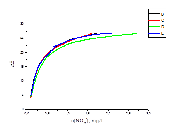 Ключевые слова: нитрит-ион, тест-метод, пенополиуретан, хемосорбция, предел определения, цветометрия, шкала сравнения, шаг шкалы, общее цветовое различие.