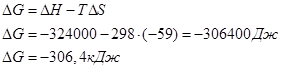 За рівнянням Гіббса визначимо як змінюватиметься ентропія та ентальпія системи: . При переході від найменш впорядкованого стану – газу до рідини чи твердого тіла ентропія зменшується. У нас в лівій частині рівняння розташовано одну молекулу газоподібних речовин, а у правій ні одної, тобто ентропія висока. А у правій не має газоподібних речовин, тобто у хімічній реакції ентропія системи зменшується.