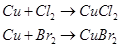 Мідь являється малоактивним металом, але із галогенами вона реагує вже при кімнатній температурі. На швидкість реакції впливає вологість, у вологому середовищі реакція прискорюється.