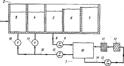 При этом вода, стекающая из резервуара 7, попадает в резервуар 6, а вода из резервуара 6 стекает в резервуар 5. Аппарат 1 состоит из резервуара 10, в который насосом 9 по трубопроводу 8 подается часть водного промывного раствора из резервуара 5. В резервуар 10 добавляется кислота и полученная смесь пропускается через фильтр для улавливания твердых частиц 12 и угольный фильтр 11; циркуляция осуществляется по трубопроводу 14 с помощью насоса 13. Отфильтрованные кислые промывные воды подаются насосом 15 через трубопровод 16 с вентилями 17 и 18 обратно в никелировальные ванны 3 и 4.
