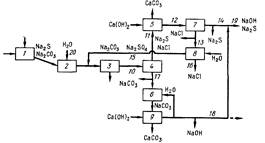 Кристаллический карбонат натрия, полученный в сепараторе 4, растворяют в аппарате 6 и подают в аппарат для подщелачивания 9. В результате получают раствор 18, содержащий в основном гидроксид натрия; в нем могут присутствовать и некоторые количества примесей. Раствор гидроксида натрия используют для приготовления варочного раствора, однако он может найти применение в любой стадии процесса, в которой используется гидроксид натрия.
